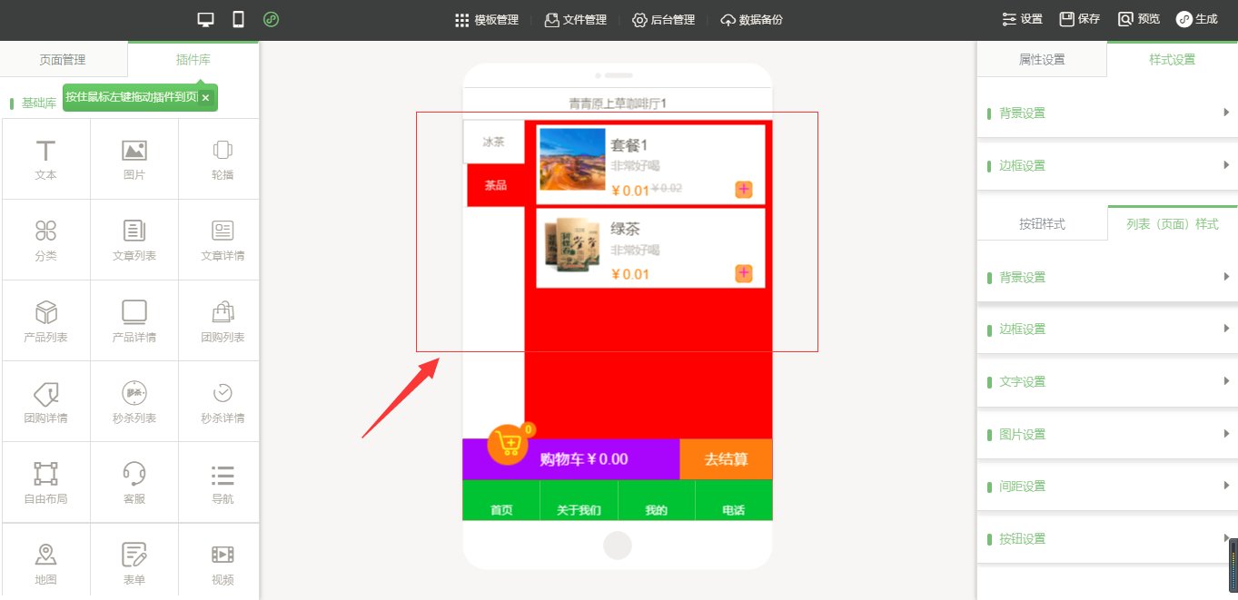 3.在小程序编辑器中,拖入插件“手机点单”,该插件为内页插件,我们可以在页面中给小程序页面进行布局,然后点击“开始点单”按钮进行属性及样式设置,由于需要店面的准确定位,因此需要申请地图的API密钥,具体操作可以看帮助文档,在样式设置中,“背景设置”与“边框设置”是全局设置,是针对该小程序插件页面的整体设置,“按钮样式”则是仅针对于“手机点单”入口按钮的设置;“列表(页面)设置”是针对该菜品列表页的设置,里面的“文字设置”中可以设置需要的显示项,设置完成之后点击保存即可(注:当后台没有添加任何数据时,该列表页中会出现一组假的数据,仅供参考使用,当后台添加数据之后,该列表会自动换成真实数据),如图所示: