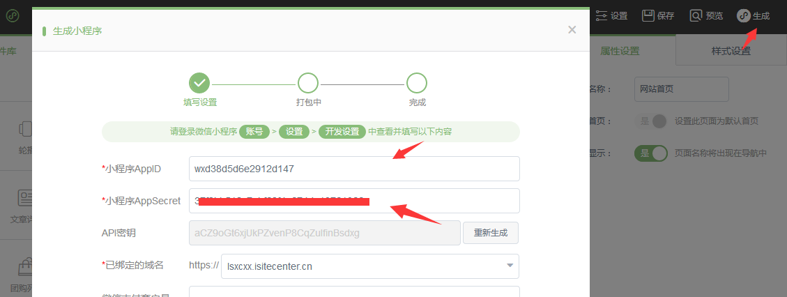 1、首先在网站右上角点击生成小程序 配置好 小程序appid ,小程序appSecret