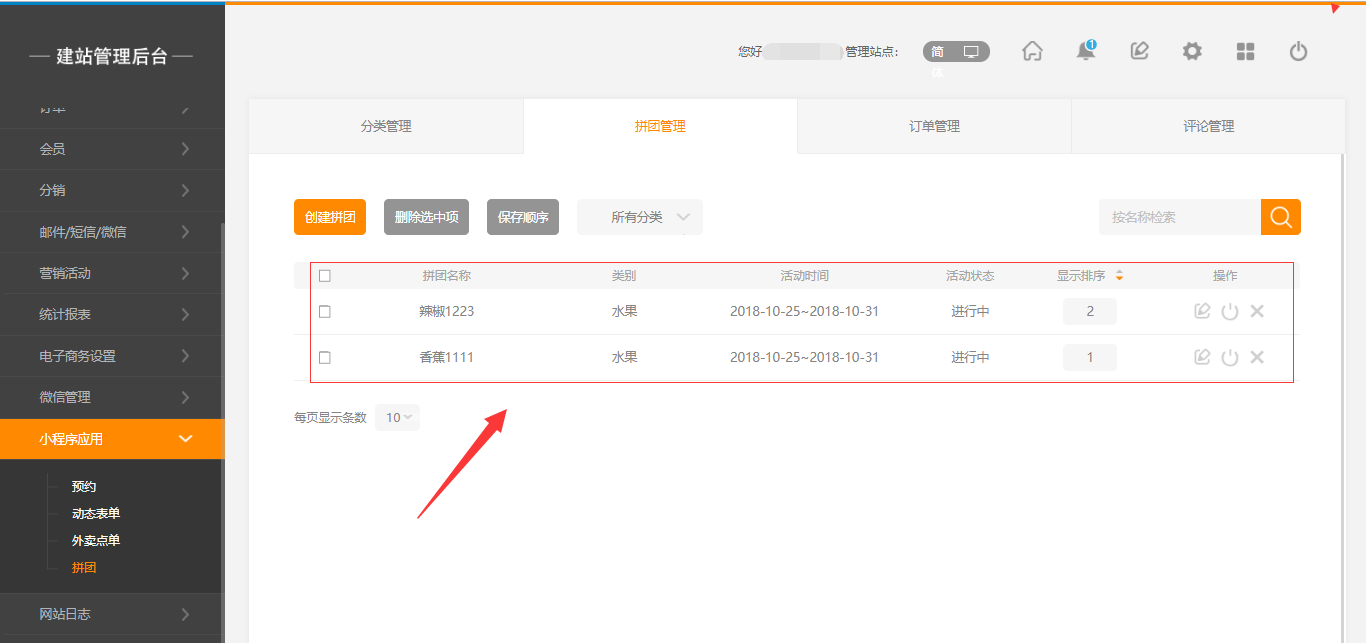 1.点击建站后台“小程序应用”-“拼团”-“创建拼团”,填写拼团的信息。