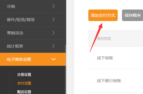 ①.后台---电子商务设置---支付设置,点击添加支付方式