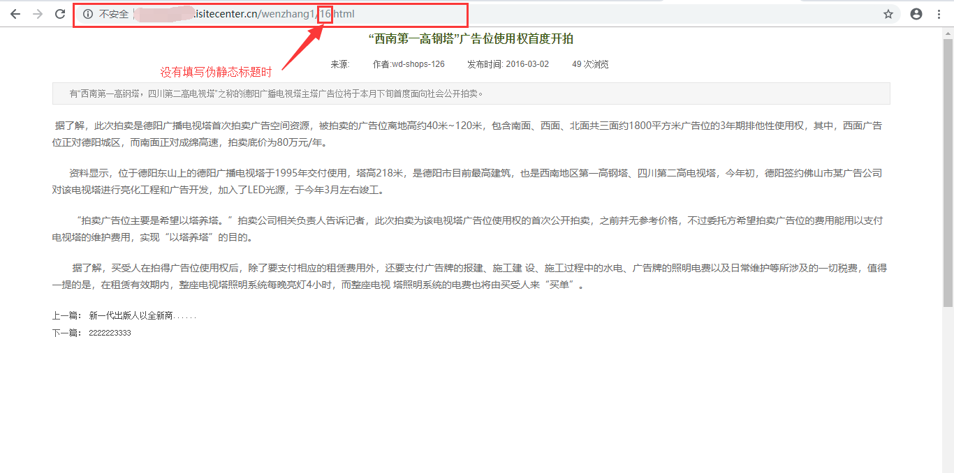 2.前台伪静态规则添加完成后,在建站后台添加文章或产品时,会有“伪静态标题”填写项(非必填),如果没有填写伪静态的标题,系统则会自动分配,如图所示: